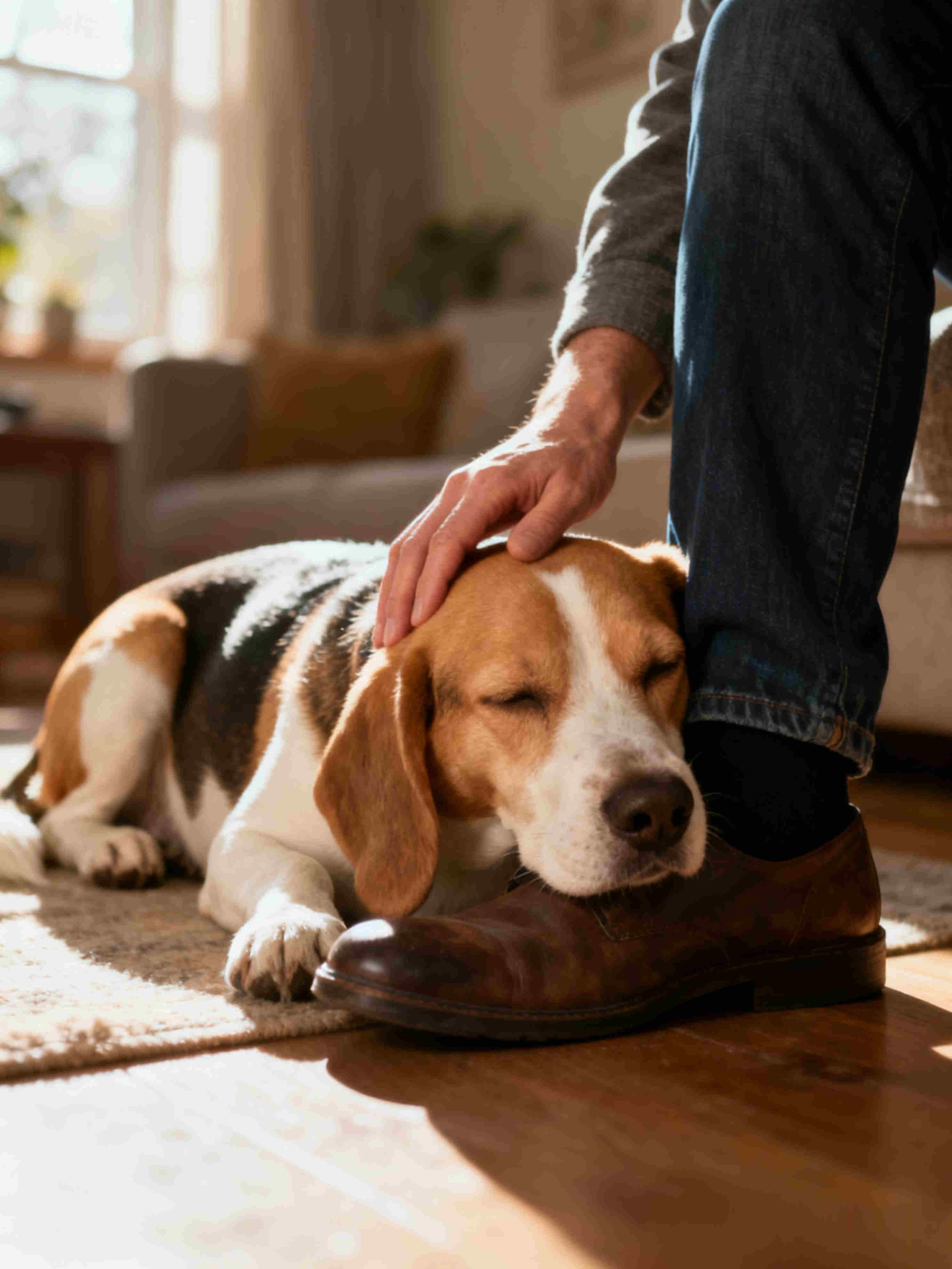 它不会吵闹,只会轻轻走到你身边,用湿乎乎的鼻子蹭蹭你的手背,再小心翼翼趴在你脚边,脑袋枕着你的裤腿。
